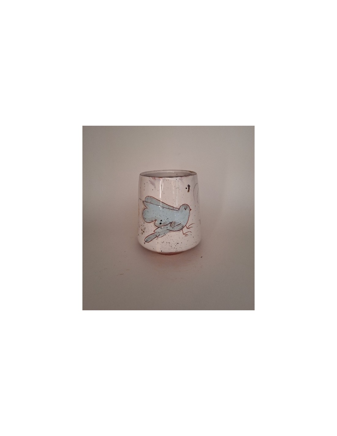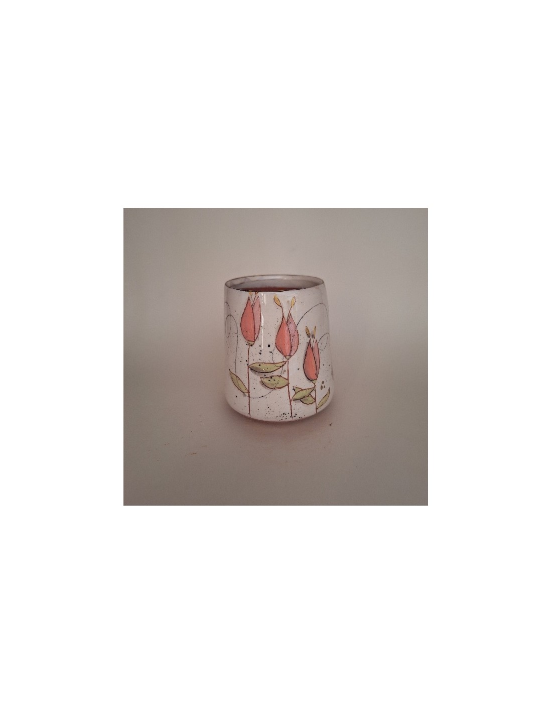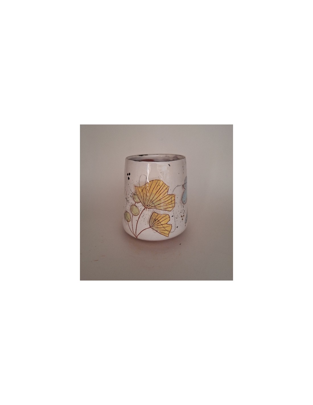 Le Mug est en terre vernissée et dorée à l'or fin. Chaque pièce est entièrement réalisée par mes soins. Cette pièce est tournée. Son décor est dessiné à la main ce qui fait que chaque pièce est unique. Chaque pièce subit 3 cuissons: une cuisson à 980° et une seconde à 1020° plus une cuisson supplémentaire pour l'application de l'or.