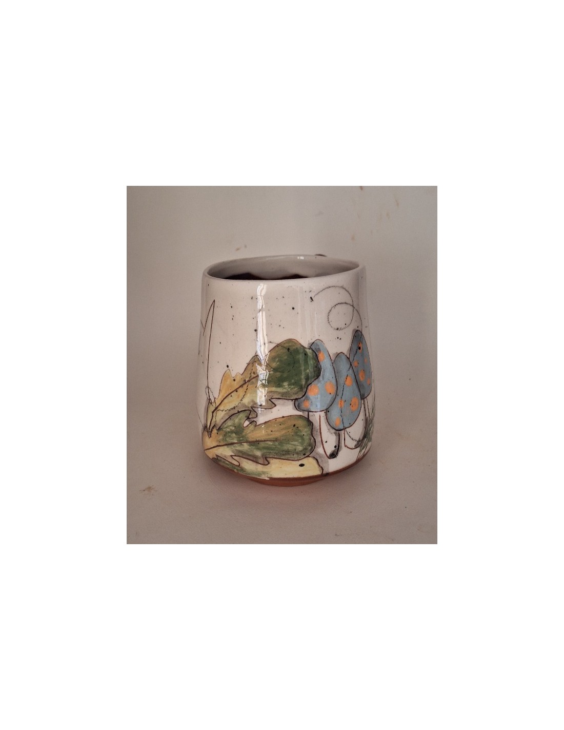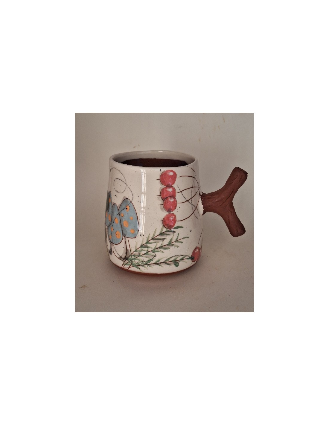 Le mug est en terre vernissée. Chaque pièce est entièrement réalisée par mes soins. Cette pièce est réalisée à la plaque puis pliée comme une feuille. Son décor est dessiné à la main ce qui fait que chaque pièce est unique. Chaque pièce subit 2 cuissons: une cuisson à 980° et une seconde à 1020°.