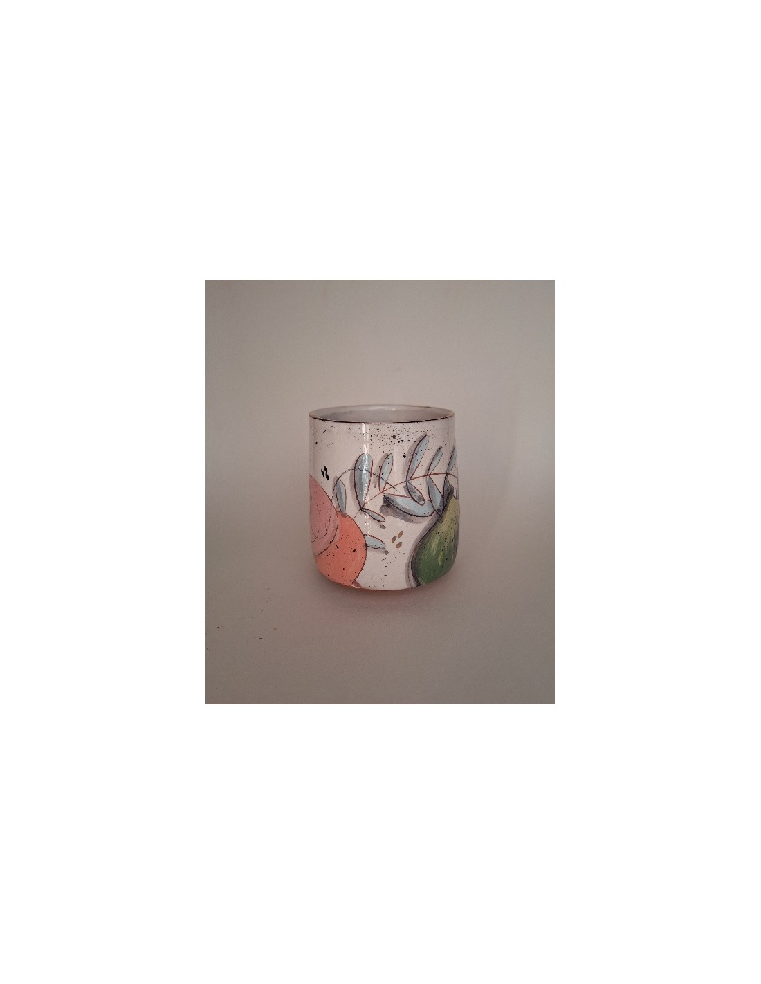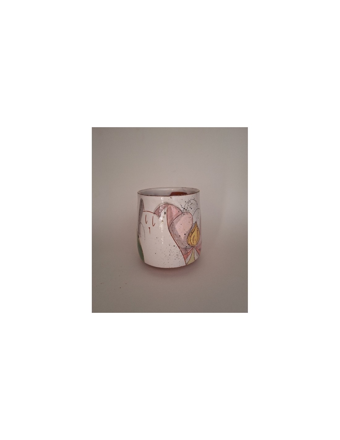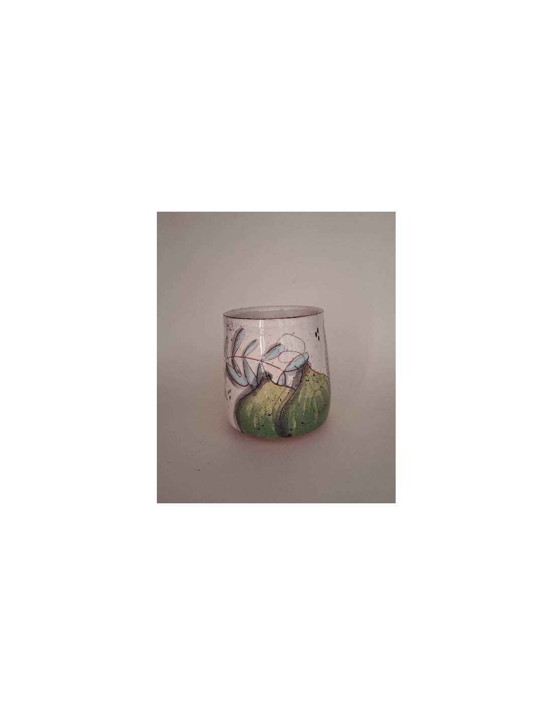 Le Mug est en terre vernissée et dorée à l'or fin. Chaque pièce est entièrement réalisée par mes soins. Cette pièce est tournée. Son décor est dessiné à la main ce qui fait que chaque pièce est unique. Chaque pièce subit 3 cuissons: une cuisson à 980° et une seconde à 1020° plus une cuisson supplémentaire pour l'application de l'or.
