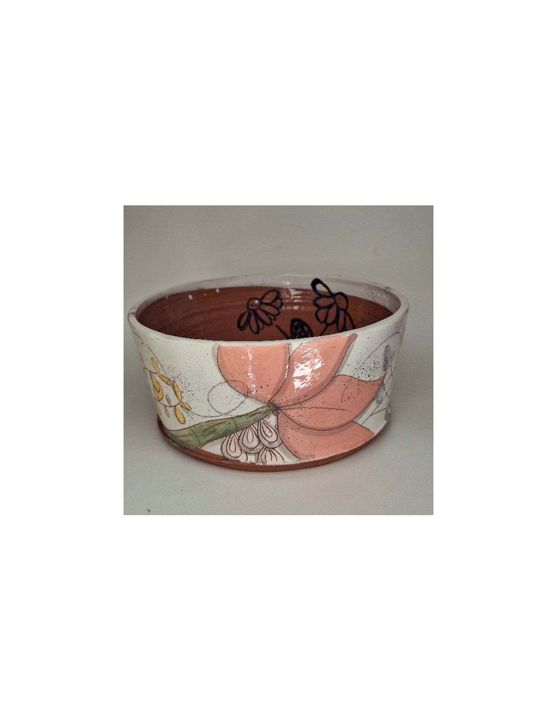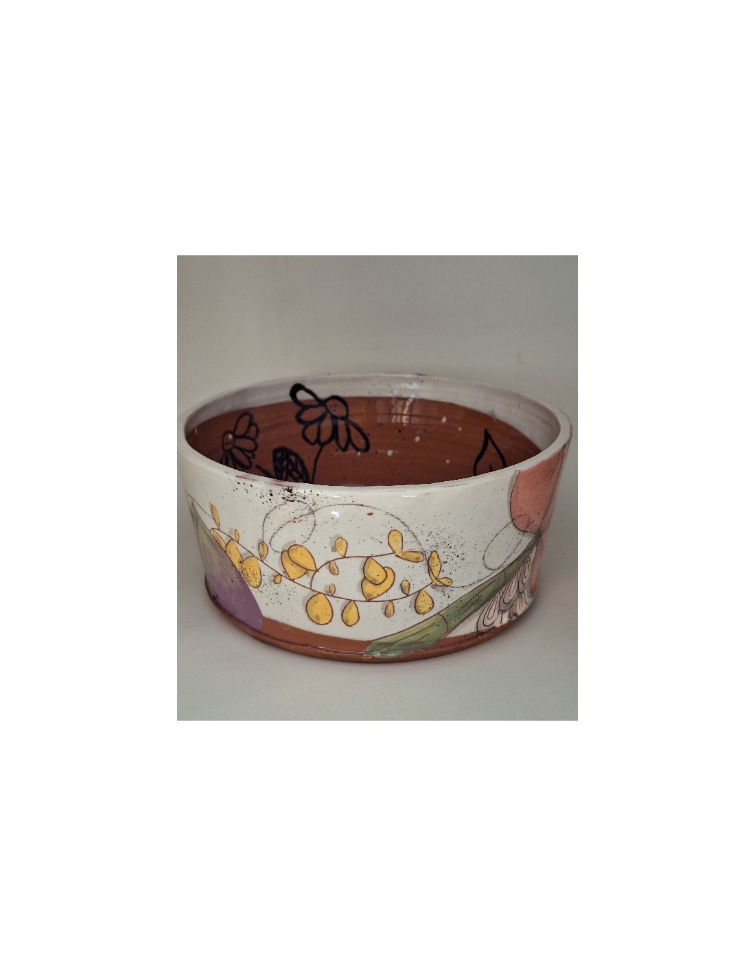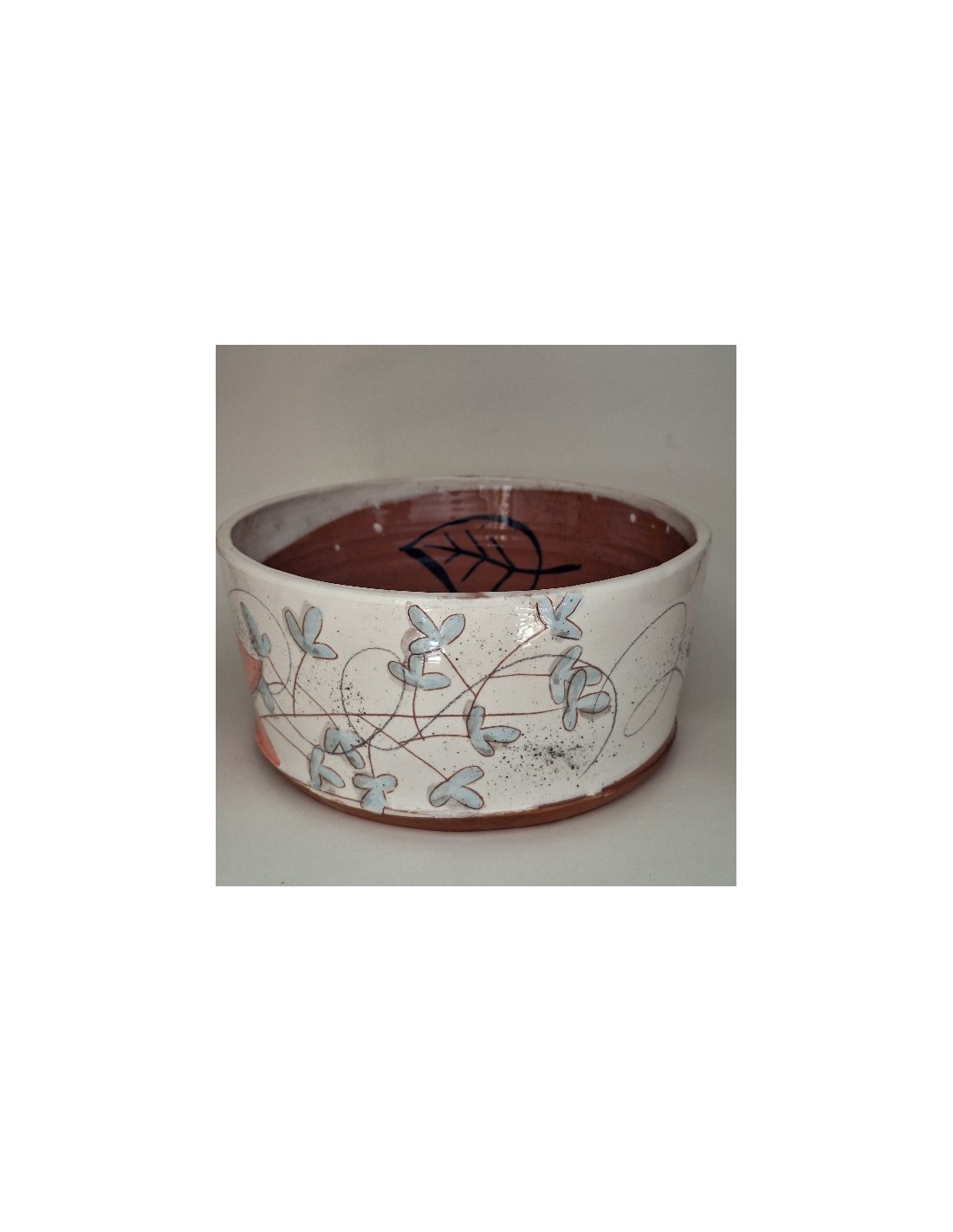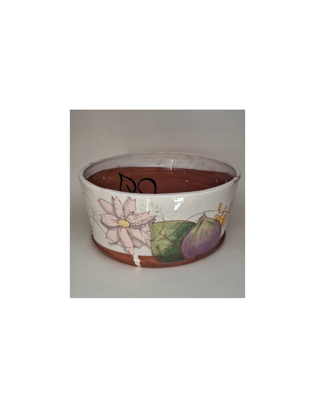 Le saladier est en terre vernissée. Chaque pièce est entièrement réalisée par mes soins. Cette pièce est tournée. Son décor est dessiné à la main ce qui fait que chaque pièce est unique. Chaque pièce subit 2 cuissons: une cuisson à 980° et une seconde à 1020°.