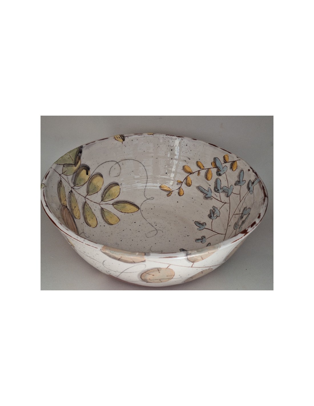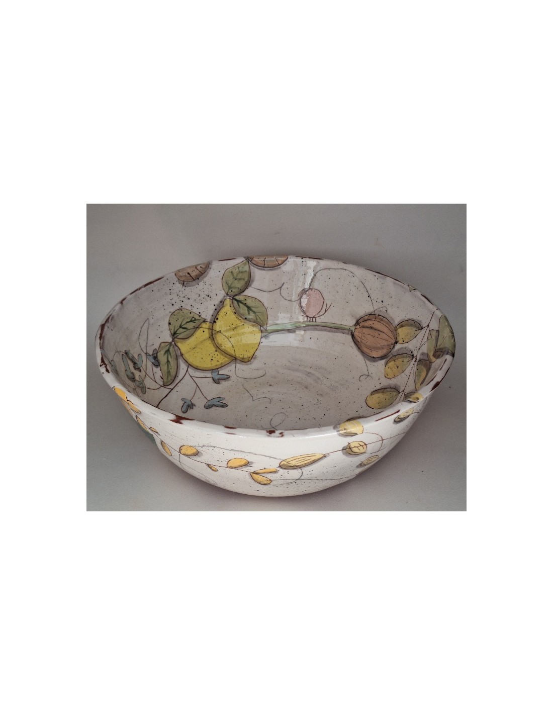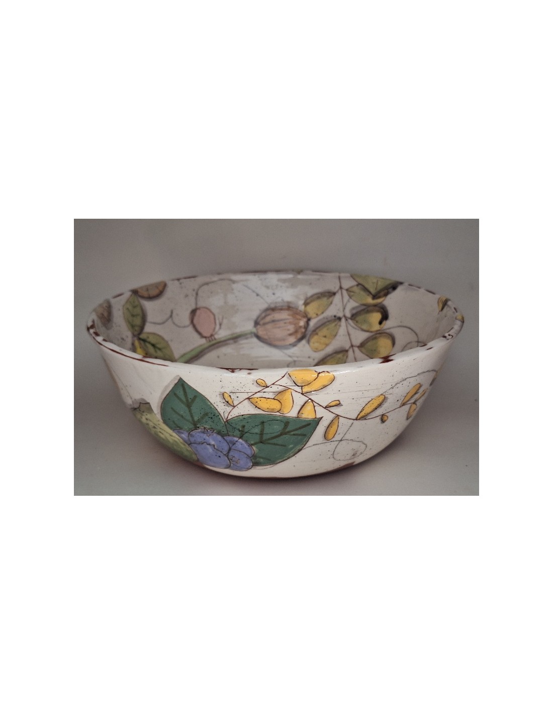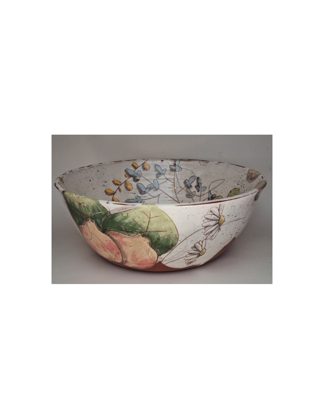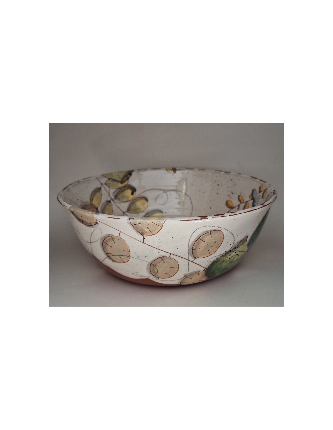 Le saladier est en terre vernissée. Chaque pièce est entièrement réalisée par mes soins. Cette pièce est tournée. Son décor est dessiné à la main ce qui fait que chaque pièce est unique. Chaque pièce subit 2 cuissons: une cuisson à 980° et une seconde à 1020°.