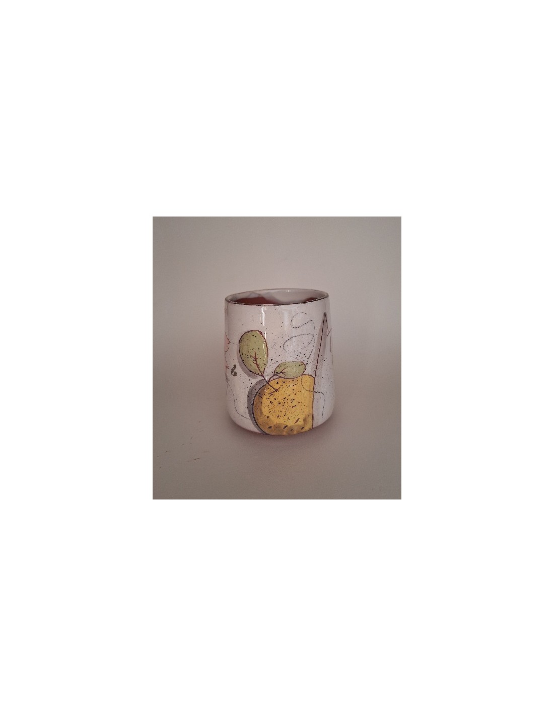Le Mug est en terre vernissée et dorée à l'or fin. Chaque pièce est entièrement réalisée par mes soins. Cette pièce est tournée. Son décor est dessiné à la main ce qui fait que chaque pièce est unique. Chaque pièce subit 3 cuissons: une cuisson à 980° et une seconde à 1020° plus une cuisson supplémentaire pour l'application de l'or.