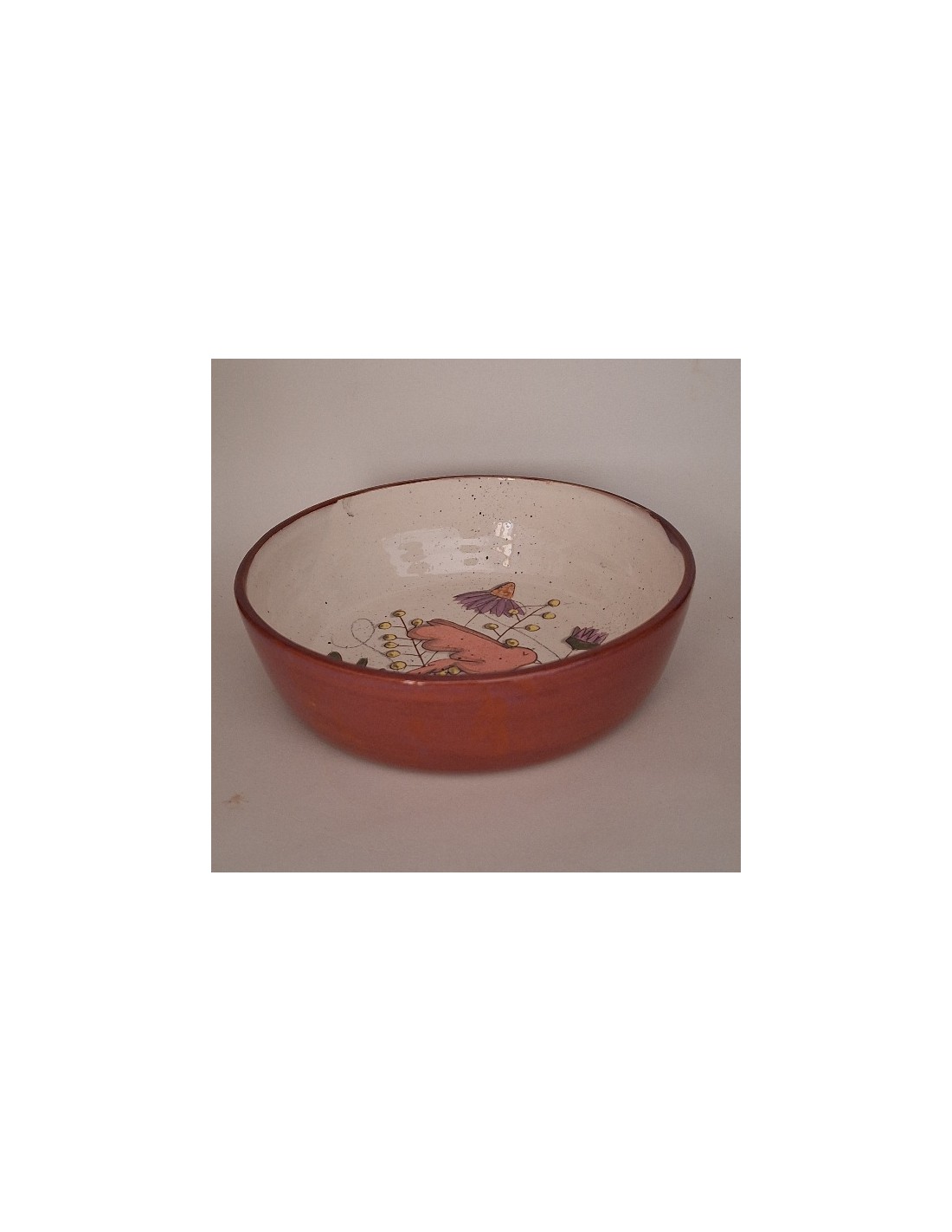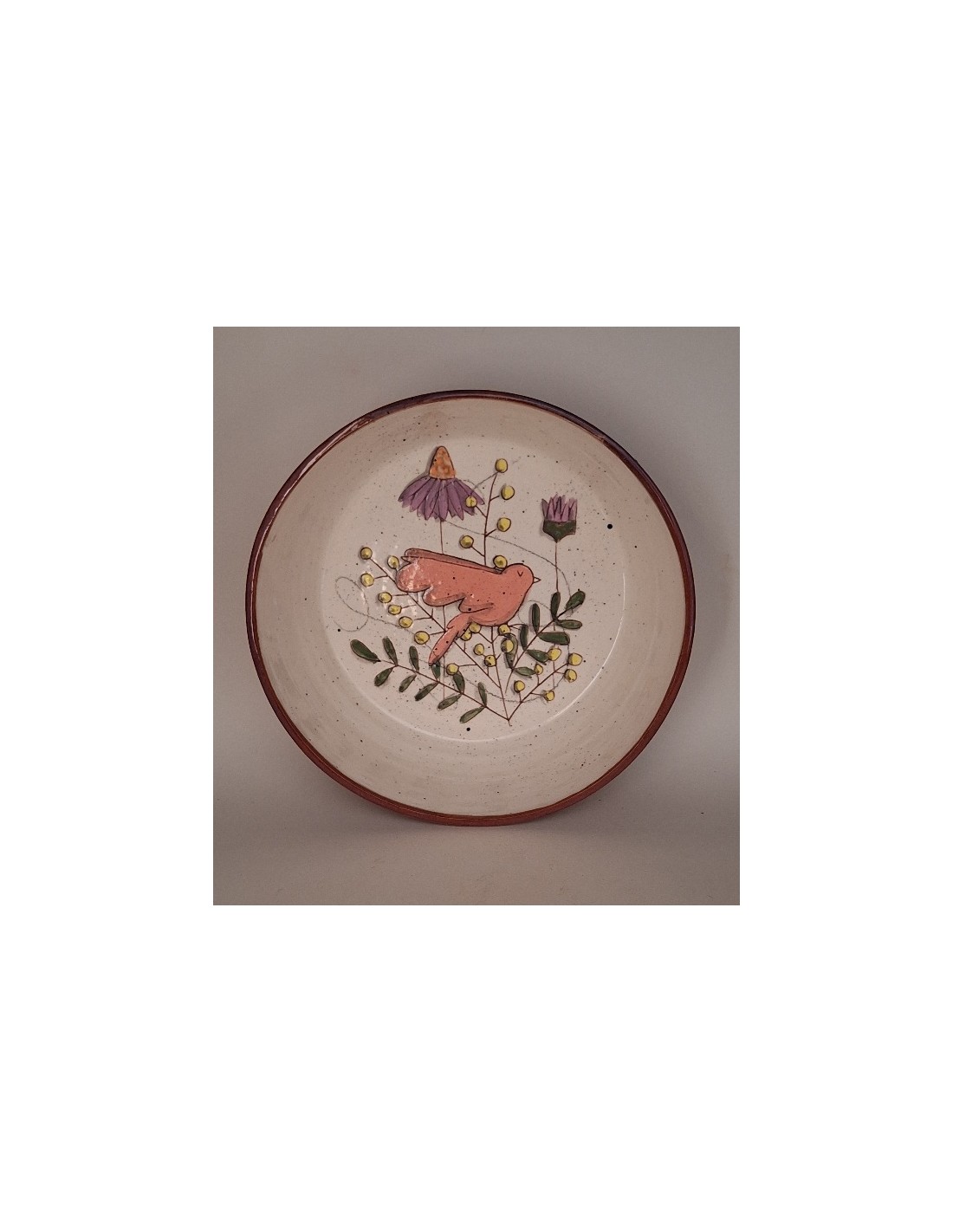 L'assiette est en terre vernissée. Chaque pièce est entièrement réalisée par mes soins. Cette pièce est tournée. Son décor est dessiné à la main ce qui fait que chaque pièce est unique. Chaque pièce subit 2 cuissons: une cuisson à 980° et une seconde à 1020°.