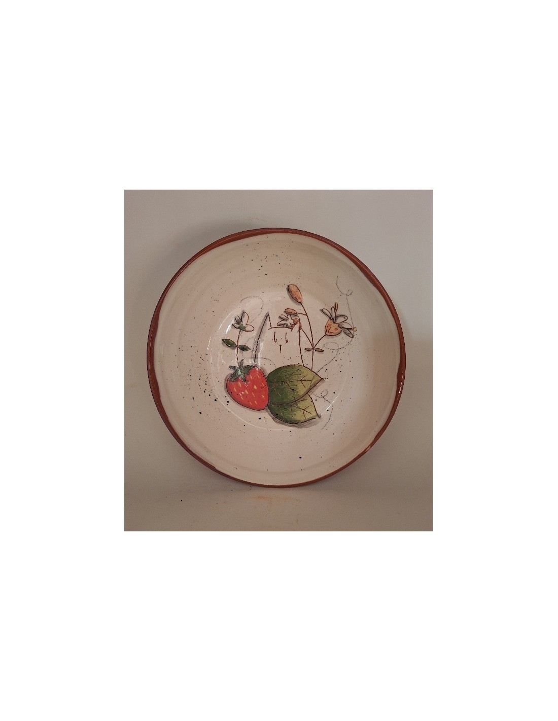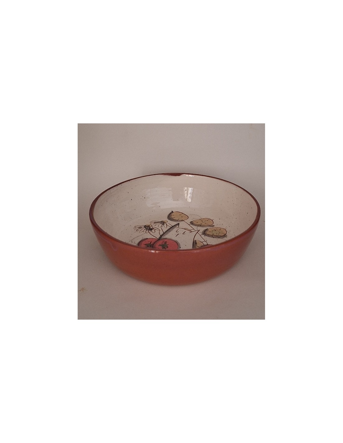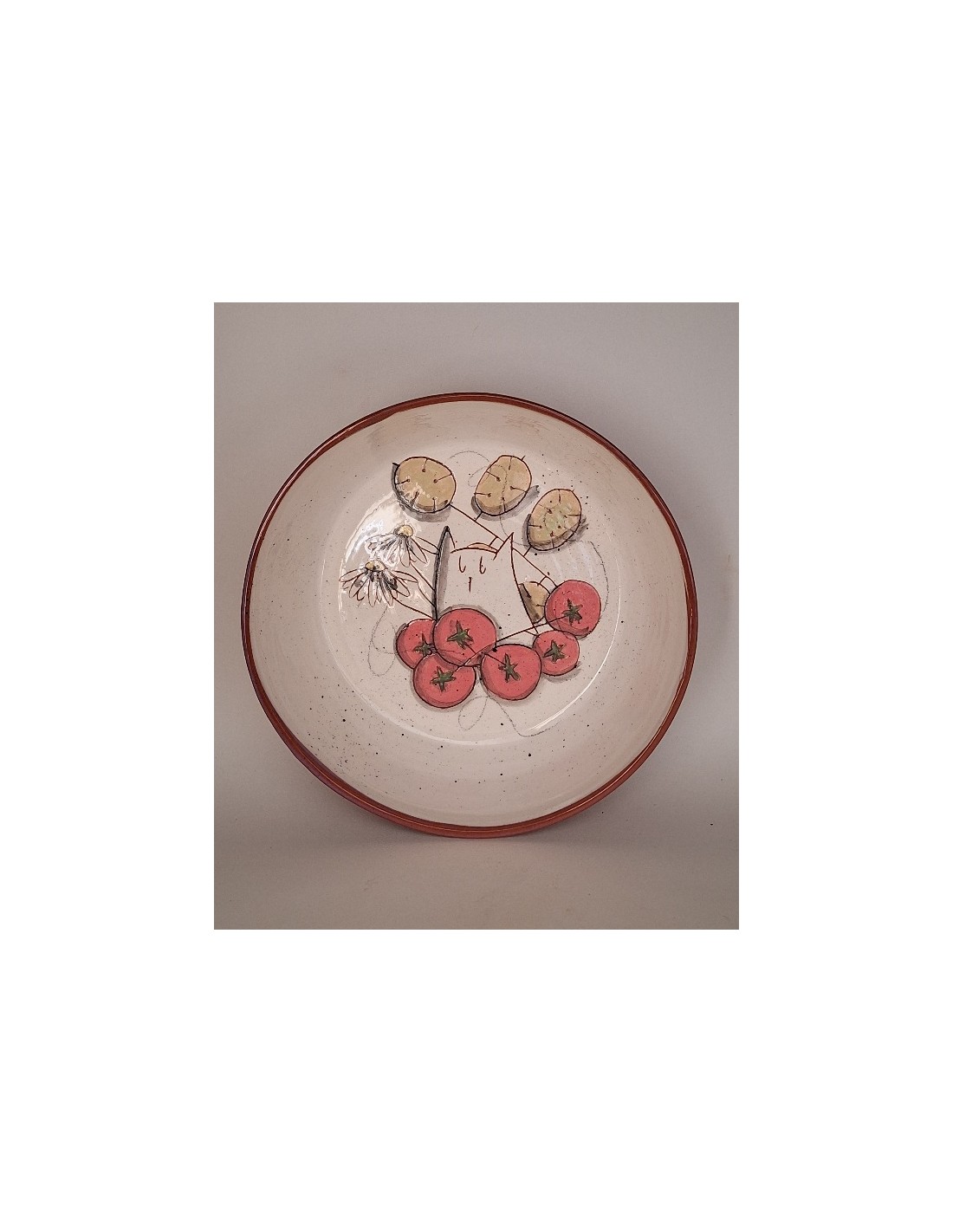 L'assiette est en terre vernissée. Chaque pièce est entièrement réalisée par mes soins. Cette pièce est tournée. Son décor est dessiné à la main ce qui fait que chaque pièce est unique. Chaque pièce subit 2 cuissons: une cuisson à 980° et une seconde à 1020°.