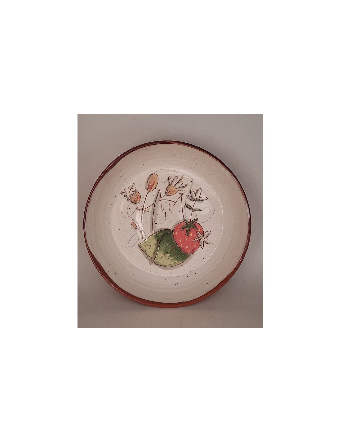 L'assiette est en terre vernissée. Chaque pièce est entièrement réalisée par mes soins. Cette pièce est tournée. Son décor est dessiné à la main ce qui fait que chaque pièce est unique. Chaque pièce subit 2 cuissons: une cuisson à 980° et une seconde à 1020°.