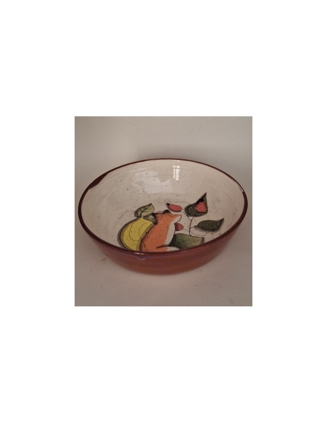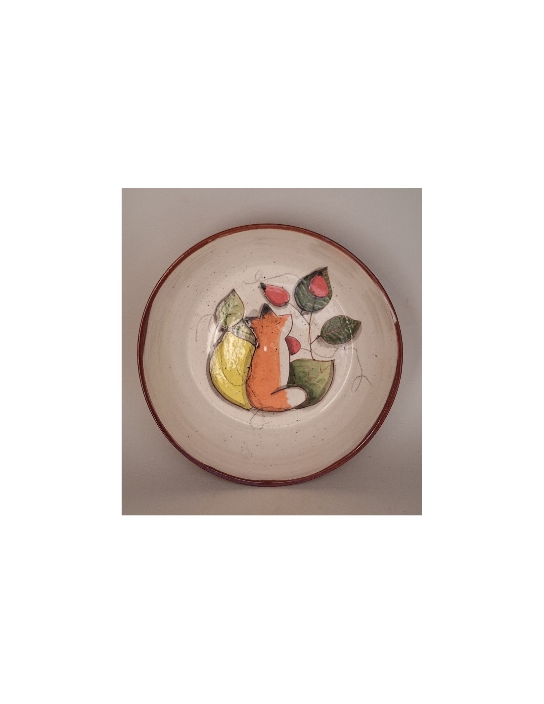 L'assiette est en terre vernissée. Chaque pièce est entièrement réalisée par mes soins. Cette pièce est tournée. Son décor est dessiné à la main ce qui fait que chaque pièce est unique. Chaque pièce subit 2 cuissons: une cuisson à 980° et une seconde à 1020°.