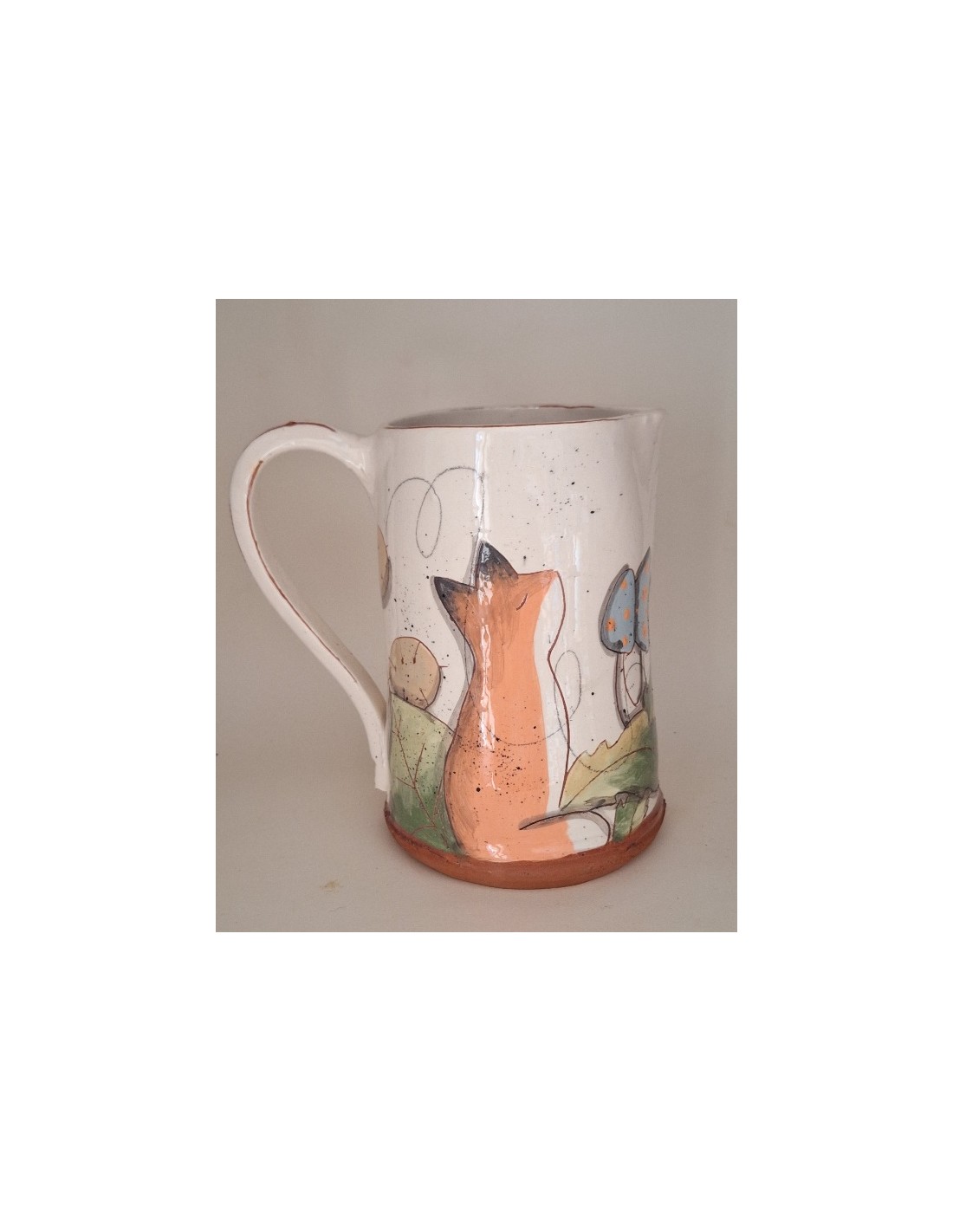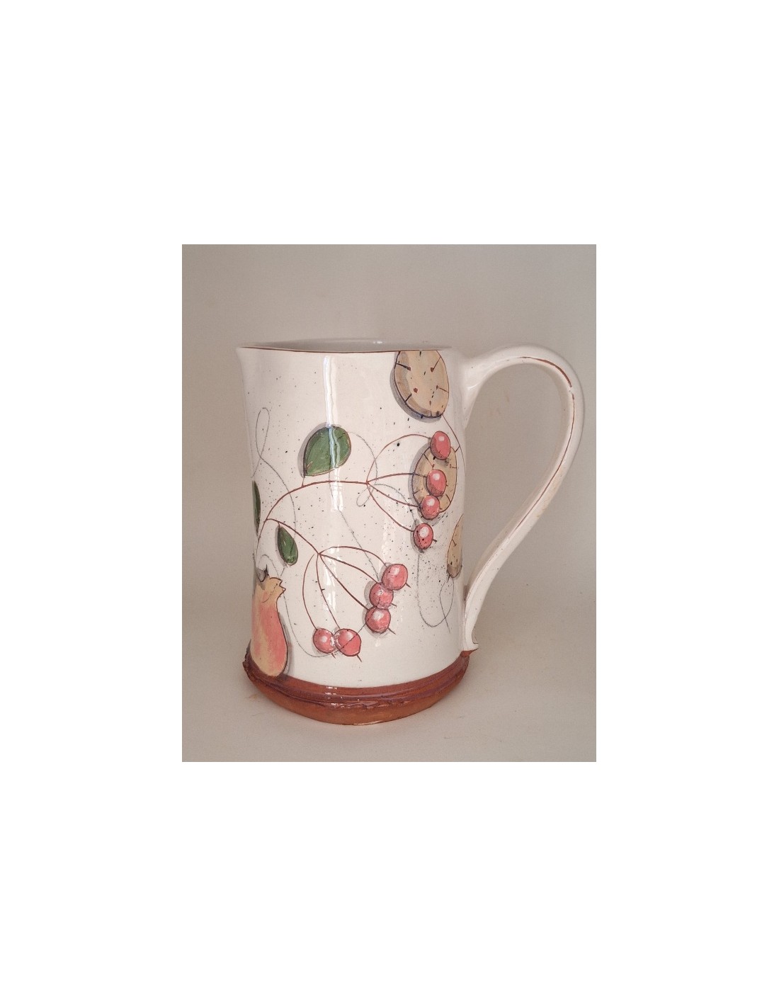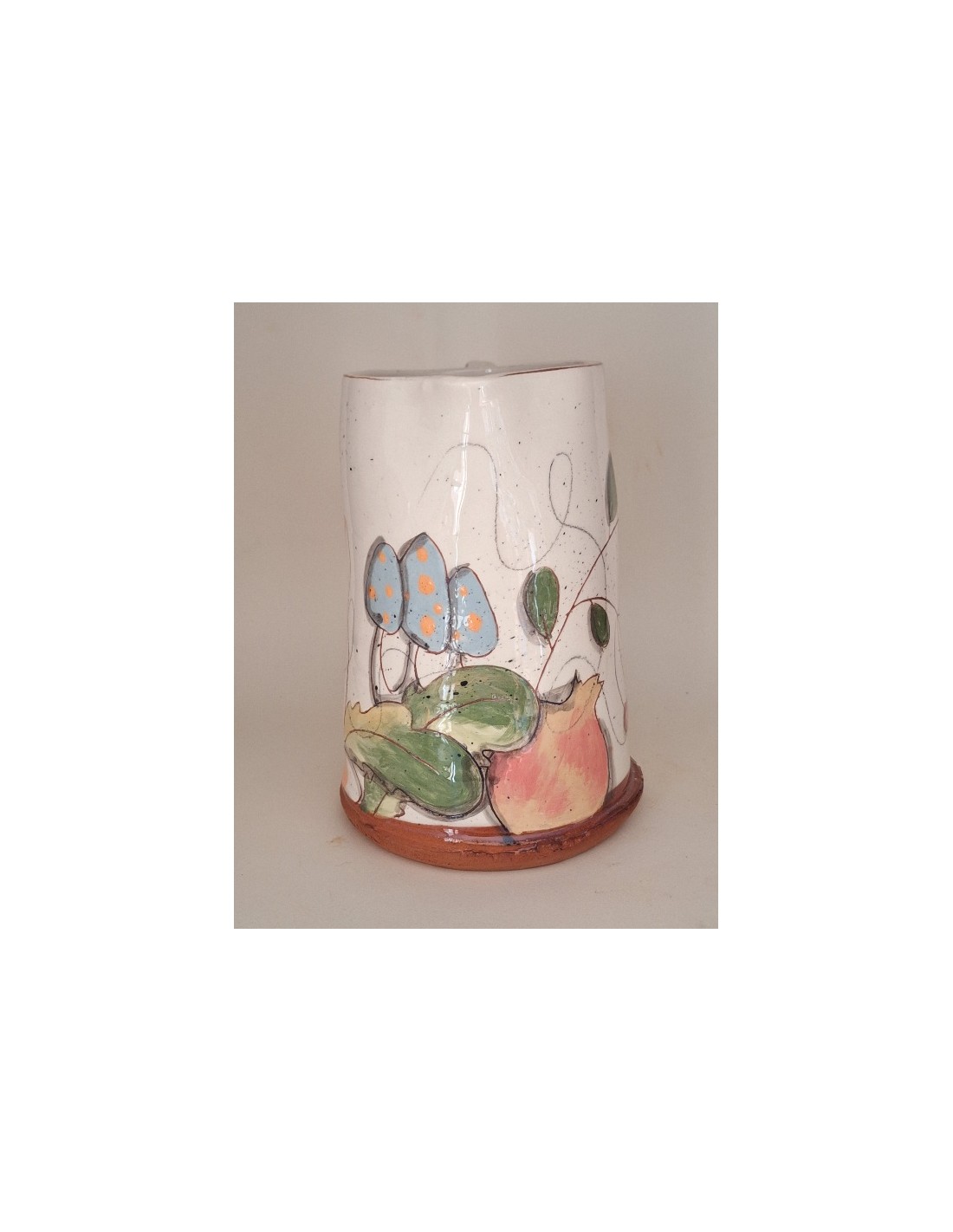 Le pichet est en terre vernissée. Chaque pièce est entièrement réalisée par mes soins. Cette pièce est tournée. Son décor est dessiné à la main ce qui fait que chaque pièce est unique. Chaque pièce subit 2 cuissons: une cuisson à 980° et une seconde à 1020°.