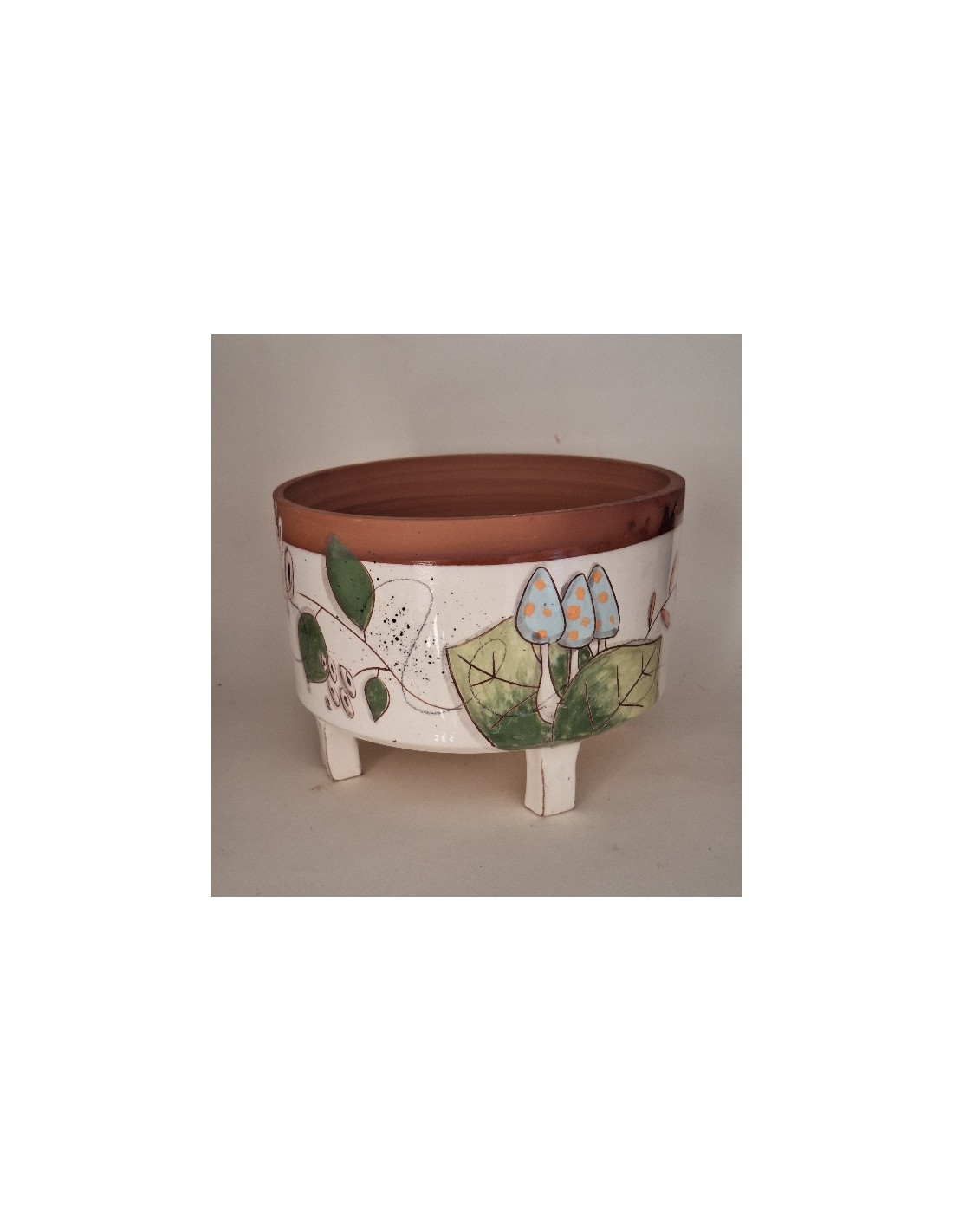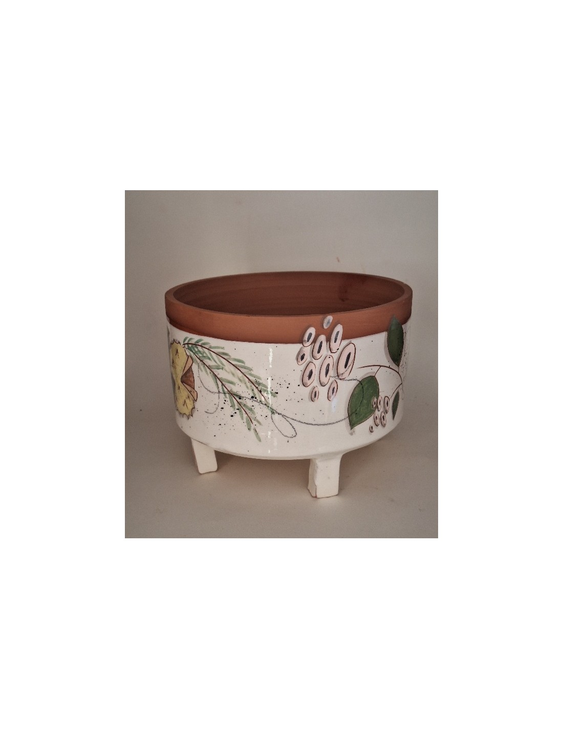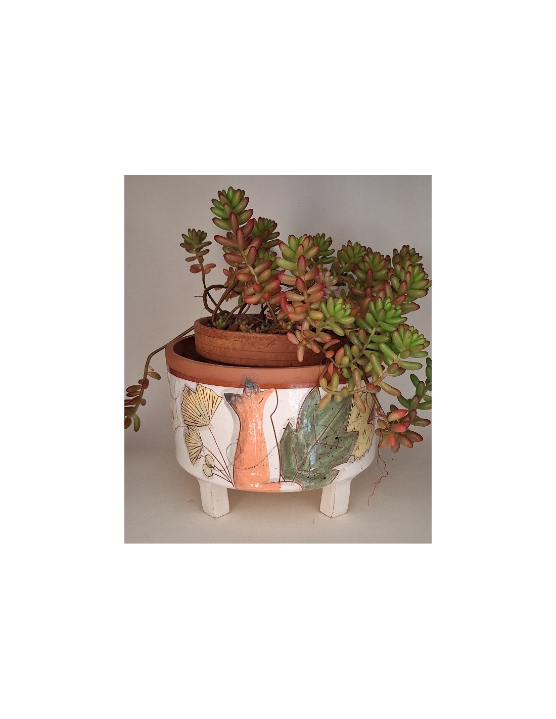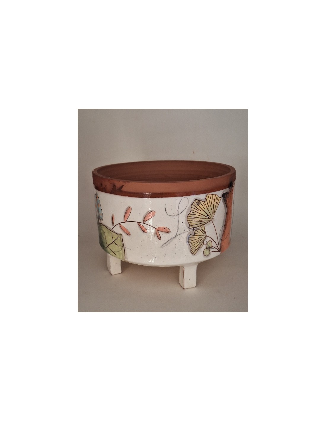 Le cache-pot est en terre vernissée. Chaque pièce est entièrement réalisée par mes soins. Cette pièce est tournée. Son décor est dessiné à la main ce qui fait que chaque pièce est unique. Chaque pièce subit 2 cuissons: une cuisson à 980° et une seconde à 1020°. le cache-pot est émaillé seulement à l’extérieur