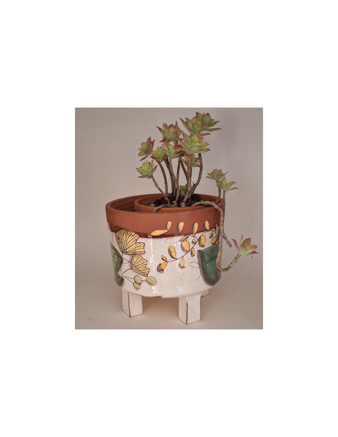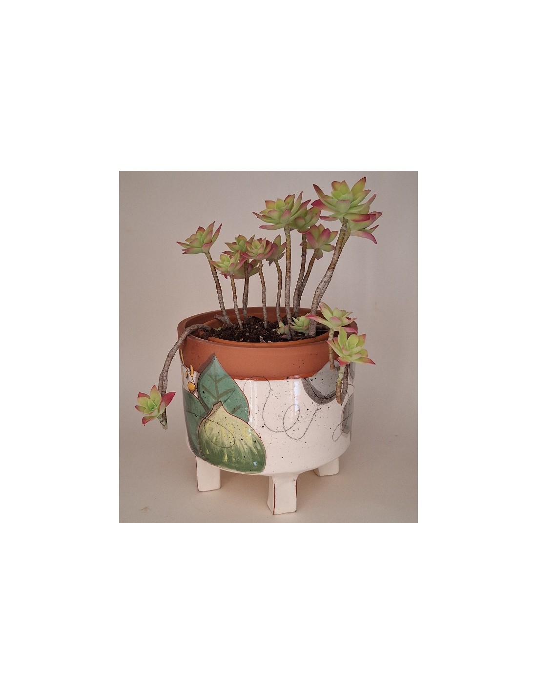 Le cache-pot est en terre vernissée. Chaque pièce est entièrement réalisée par mes soins. Cette pièce est tournée. Son décor est dessiné à la main ce qui fait que chaque pièce est unique. Chaque pièce subit 2 cuissons: une cuisson à 980° et une seconde à 1020°. le cache-pot est émaillé seulement à l’extérieur